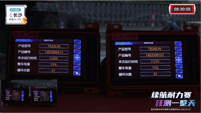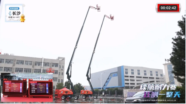 本次发布的最大亮点,摒弃了传统宣讲,采用全程实时直播对比测试的方式,直观呈现技术实力。在长达8小时的马拉松式测试中,两台同型号星邦电动直臂设备同场竞技:①号车搭载全新的双效节能技术Dual-E™,②号车则为普通配置。两者同电量,同载荷,同臂架循环动作工况进行续航PK。