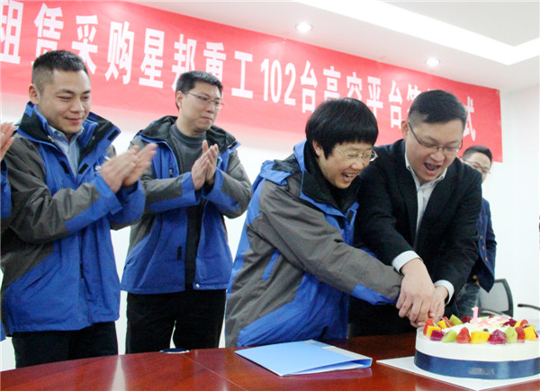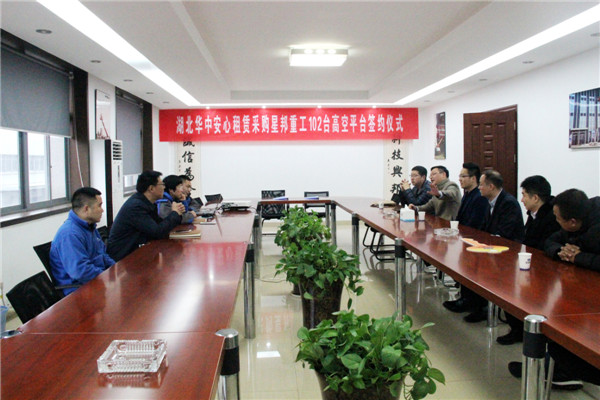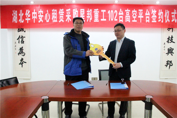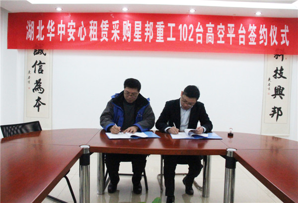 3月16日,华中安心租赁采购星邦重工102台剪叉和臂式高空设备签约仪式在星邦工业园举行。星邦重工总经理许红霞、营销总监葛庆、华中安心租赁有限公司董事长侯超和安心租赁核心团队参加,巧合的是今天是安心租赁与星邦重工合作一周年的日子!