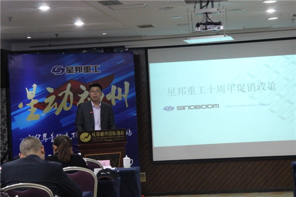 星邦重工营销总监营销公司总经理葛庆先生做行业报告和星邦360°解决方案分享,以及星邦十周年感恩政策解读。