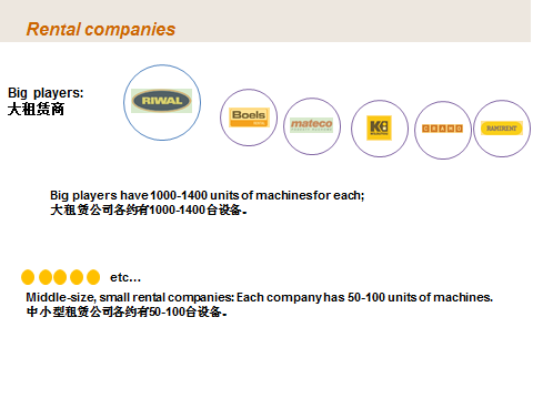 目前波兰市场,最大的租赁公司约6-8家,包括RIWAL, BOELS,MATECO等国际租赁公司。大型租赁公司约各有1000-1500台设备,其他中小型租赁公司约仅有50-100台设备。主要的机器品牌有GENIE, JLG, HAULOTTE , MANITOU , SKYJECK。