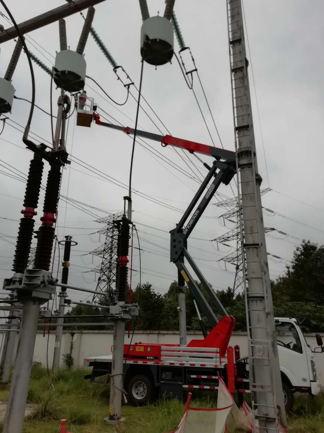 - 工作臂可左、右 360°连续旋转,同时还配有应急泵,载人可旋转自动调平工作斗配备称重传感器、无线遥控操作、一键调平和一键收车;