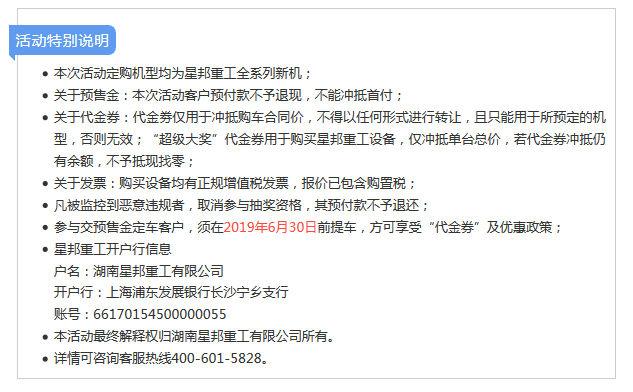 1、活动期间,客户通过签订“定购协议书”,交纳购车预售金至星邦重工账户;