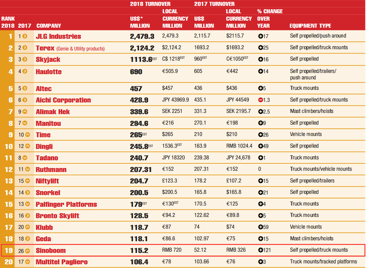 星邦重工最近喜讯不断,刚入选国家级第一批专精特新“小巨人”企业名单,又从海外传来好消息,英国KHL集团旗下《Access International》(世界知名高空作业平台杂志)发布了“2018 ACCESSM20榜单”(2018年全球高空作业平台制造企业20强)。