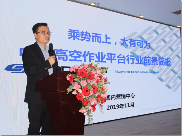 国内营销总监李标志分别从市场环境、2014-2019年国内市场分析、未来机遇与挑战三个方面介绍了国内高空作业平台行业前景。